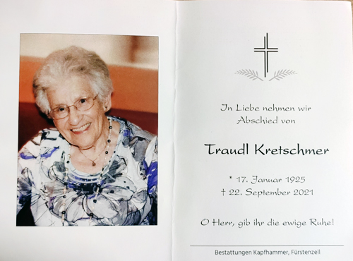Auch wenn jeder sie schmerzlich vermissen wird, sind doch alle glücklich, wie erfüllt ihr Leben war und wie sie ein jedes der verschiedenen Familienmitgleider und Freunde auf ihre Art bereicherte. In vielen schönen gemeinsamen Erinnerungen lebt Traudl in den Gedanken und im Herzen weiter. Bis auch wir uns wiedersehen.