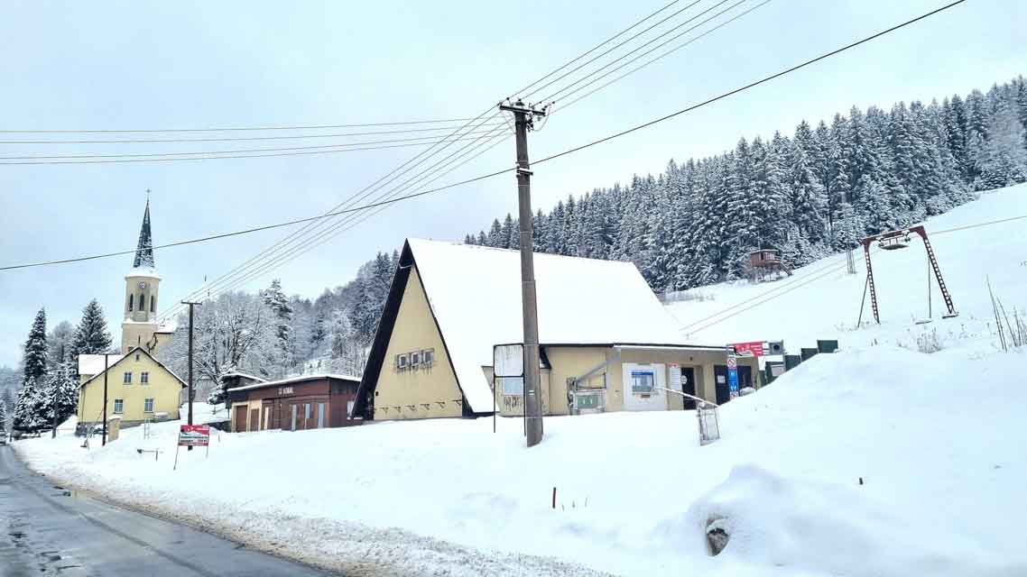 Skilift und Kirche am Bau